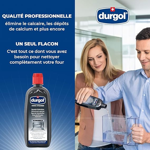 durgol Swiss Steamer Special Descaler. Does your oven offer poor cooking? Have you thought about descaling your oven? With Durgol swiss steamer, descaling your machine becomes easier. Use a bottle (500 ml) of the descaler to clean your oven, follow the instructions indicated and finally enjoy your dishes with exquisite quality. Product description: Suitable for steamers, steam heaters, boiler evaporators and water tanks. Solves limescale without additional laying time. A gentle and protective formula. Hygienic cleanliness: leaves no residue. in the oven. ffensive for food.Inodoredurgol – The Swiss original against limestone.Switzerland, reliable and leading in quality – it’s durgol. Since 1951 Durgol has invented new anti-limescale products with high standards of efficiency, rigor and environmental compatibility. Today, with its rich range of specific descalers and cleaning products, the brand is synonymous with effective fight against limescale. Available in more than 40 countries, Durgol has always remained true to its roots and develops and produces exclusively in Switzerland.